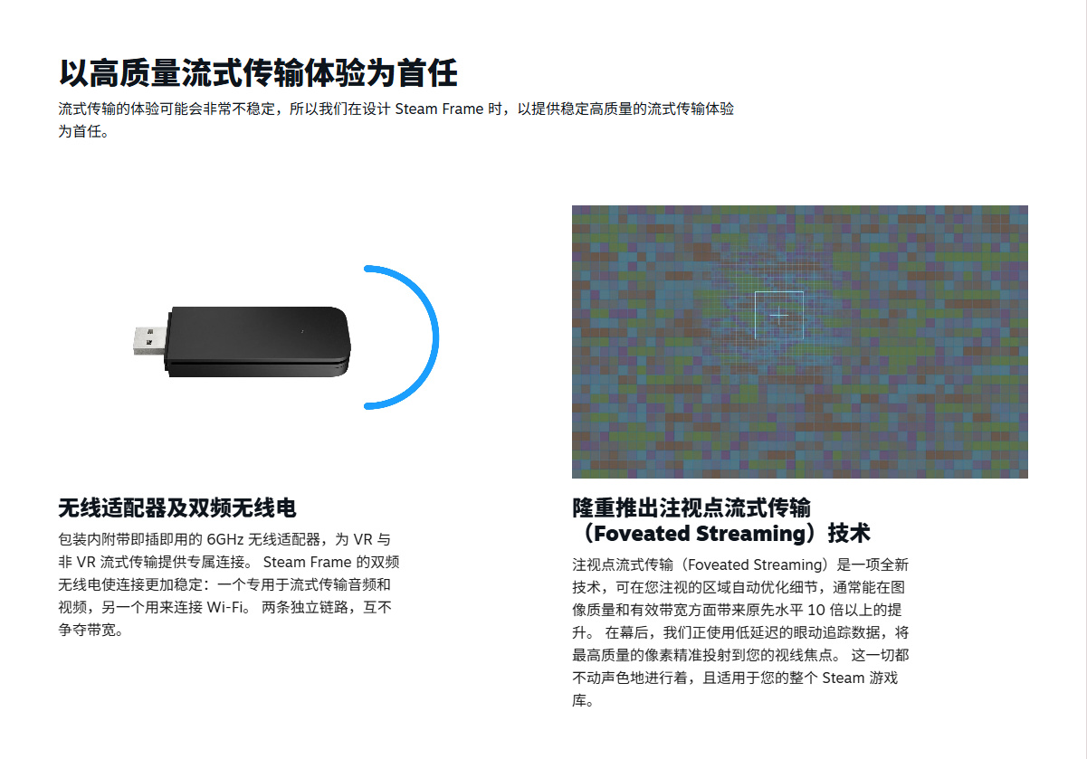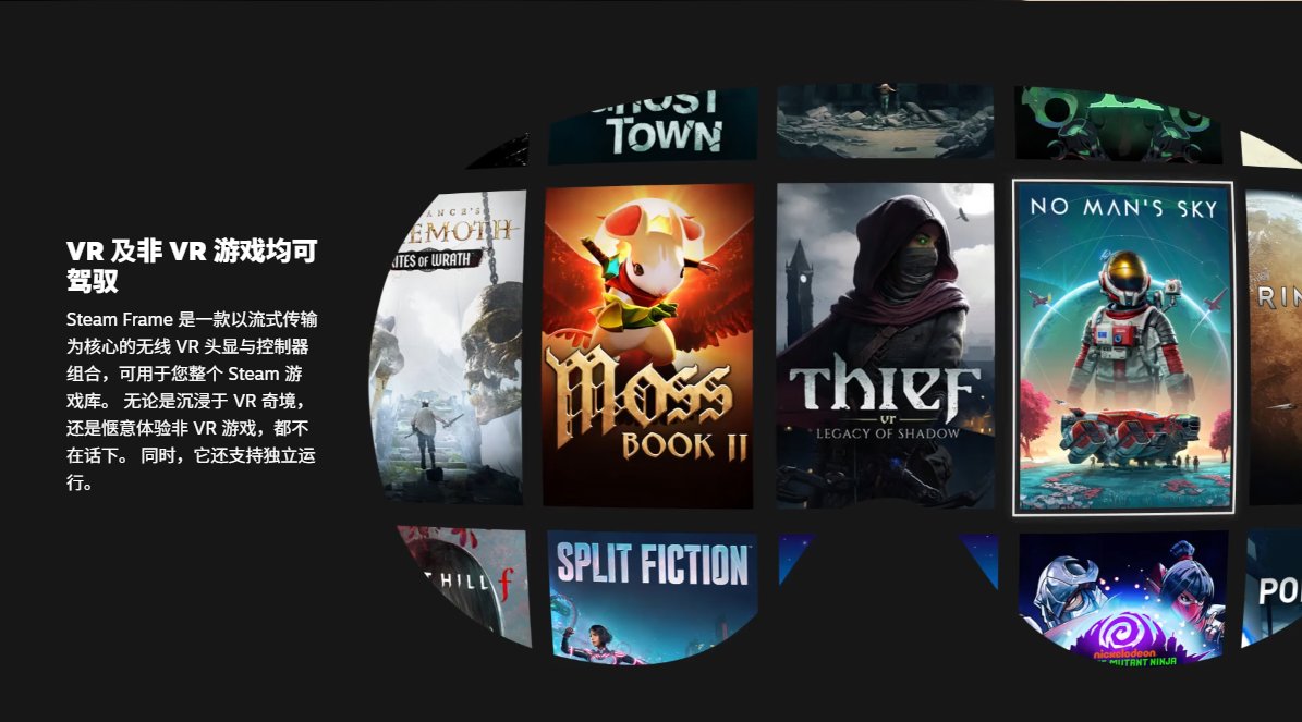 Steam Frame 是一款以流式传输 为核心的无线VR头显与控制器 组合,可用于您整个Steam游 戏库。无论是沉浸于VR奇境, 还是惬意体验非VR 游戏,都不在话下。同时,它还支持独立运 行。