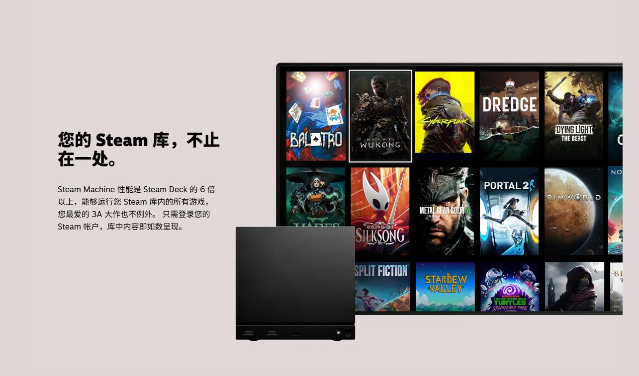 Steam Machine 性能是 Steam Deck 的 6 倍 以上,能够运行您Steam库内的所有游戏, 您最爱的3A 大作也不例外。只需登录您的 Steam帐户,库中内容即如数呈现。