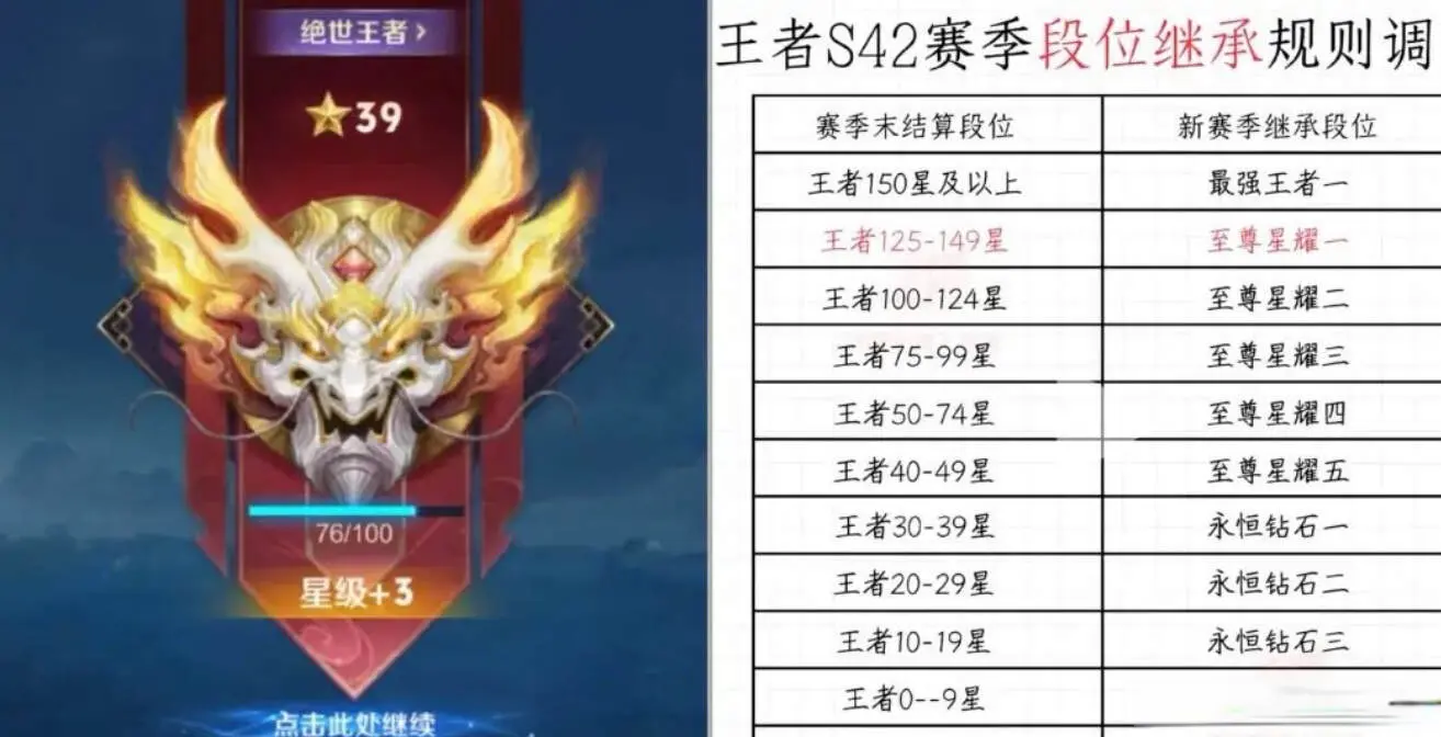 而100星以下的段位,继承的段位也同样进行了下调,最明显的区别就是原本王者30星就可以继承到星耀五了,但是更新之后,王者40星才可以继承到星耀五。