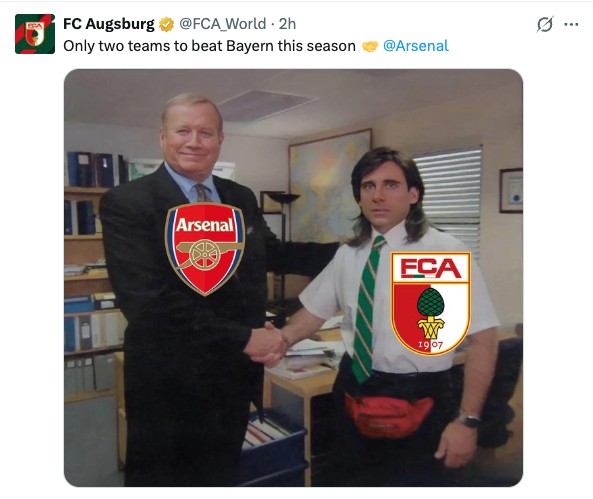 德甲第19轮,奥格斯堡客场2-1战胜拜仁慕尼黑。赛后奥格斯堡官方社媒晒和阿森纳握手梗图,并表示:“本赛季只有两支球队能击败拜仁。”同时艾特了阿森纳。